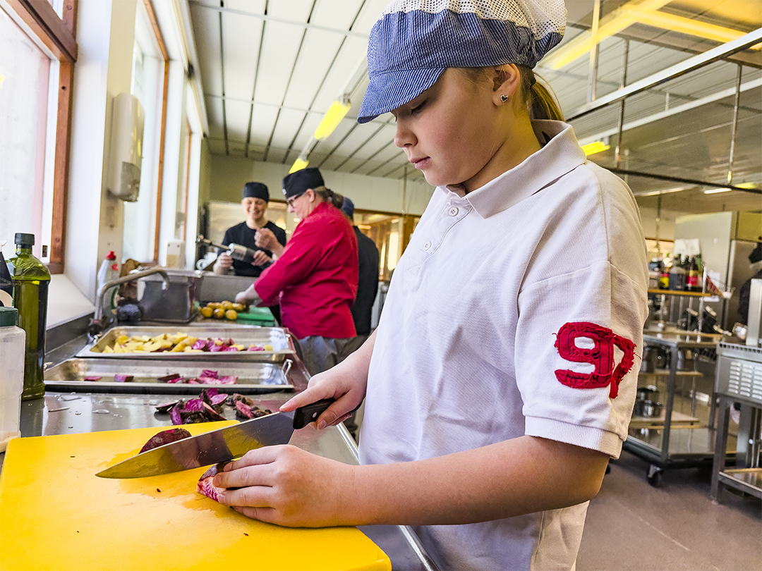 I det stora köket har deltagarna – elever, lärare, kökspersonal och kostchefer – delats upp i ett antal grupper. Alla har fått olika recept utdelade av Susanne Jonsson. En som ser fram emot dagen är Jack Vidén som går i årskurs 6 på Solenskolan.